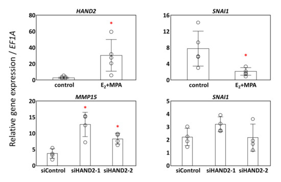 Progesterone receptor (PGR) is known to bind to the MMP19 genomic locus and to regulate MMP19 expression during decidualization [], whereas the transcriptional regulation of MMP15 during decidualization is not well understood. Therefore, we searched the ChIP-Atlas database (https://chip-atlas.org/, accessed on 23 April 2021) for transcription factors that may regulate the transcription of MMPs []. We found that HAND2, a master transcriptional regulator [,], which is upregulated in decidualization of ESCs, may bind to the upstream region of MMP2 and MMP15 genes. There are no ChIP-based studies that report the binding of HAND2 to the upstream region of other MMPs or to that of any of the TIMPs in the ChIP-Atlas database. Moreover, MMP15 is regulated by SNAI1, a transcriptional repressor, and SNAI1 is regulated by HAND2 in the heart [,]. Therefore, we examined the gene expression changes of HAND2 and SNAI1 during the decidualization of ESCs to understand their involvement in the regulation of MMP15 expression. As reported in our previous study [], HAND2 expression was significantly upregulated in ESCs with E2 + MPA treatment compared with that in the control group (Figure 3). In contrast, SNAI1 expression was significantly suppressed in ESCs with E2 + MPA treatment (Figure 3). Therefore, we examined the expression of SNAI1 and MMP15 in siRNA-mediated HAND2-silenced samples from our previous study []. We found upregulation of MMP15 expression upon silencing of HAND2 (Figure 3), suggesting a crucial role of HAND2 in regulating the baseline of MMP15 expression in ESCs. However, SNAI1 expression was not affected by the decrease in the HAND2 expression (Figure 3), thereby suggesting that SNAI1 expression in ESCs was independent of HAND2.
