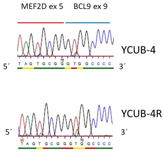 In 2016, MEF2D translocations were described in pre B-ALL, with BCL9 being the most common fusion partner of MEF2D [26]. YCUB-4 and the sister cell line YCUB-4R express the MEF2D exon 5/BCL9 exon 9 fusion transcript, resulting from t(1;1)(q21.2;q22) (Table 1, Figure 1 and Figure 2). These cell lines are from a 7 year old boy with pre-B ALL at diagnosis and relapse [27]. The MEF2D-BCL9 fusion is not the only pre-B ALL characteristic genetic alteration in this pair of cell lines. YCUB-4 and YCUB-4R also show a hemizygous loss of PAX5 (Table 1). PAX5 deletions had been found in 56/192 B-progenitor ALL cases [28].