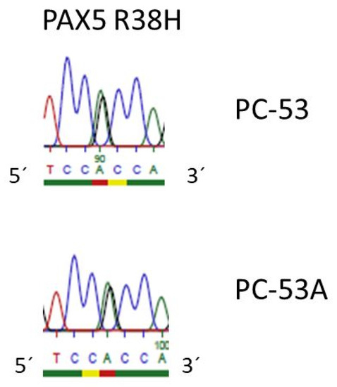 PAX5 is also a partner of translocations, and it is the target of point mutations in this disease [28,29]. PC-53, from a 33 year old woman with pre-B ALL at 3rd relapse and the sister cell line PC-53A (at the final, refractory stage) [30], carry the PAX5 R38H mutation (Table 1, Figure 3). This mutation had been described in the context of pre-B ALL (COSM5986423). Additional mutations specifically occurring in one of the sister cell lines are shown in Supplementary Table S1 (exemplarily for chromosome 14). As assessed by a principal component analysis (PCA), the sister cell lines show closely related gene expression profiles (Supplementary Figure S2).