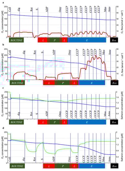 The Fluorescence-Sensor Blue of the O2k-Fluorescence LED2-Module was used with filter sets for safranin. Two sensors were inserted through the front windows of the O2k-chambers. Following air calibration, the chamber illumination was switched off. HRR provides simultaneous measurement of respiration and the safranin signal in each chamber [20]. The polarization voltage regulating light intensity was set at 500 mV at gain 1000. Safranin is a fluorophore with an excitation wavelength of 495 nm and an emission wavelength of 587 nm, and it is a lipophilic cation that accumulates in mitochondria depending on the inside negative potential in energized mitochondria [19,20]. Upon accumulation in the matrix, safranin undergoes a change in absorption and self-quenching of fluorescence [25,26]. Fluorescence intensity is linearly related to mtMP [27]. For calibration, a 200 µM stock solution of safranin was titrated in five steps to obtain final concentrations of 0.25, 0.5, 1.0, 1.5, and 2.0 µM, obtaining a linear increase of the fluorescence signal as a function of safranin concentration in the chamber. Cells were then added to the chambers. In the absence of respiratory inhibitors, the mtMP builds up on the basis of endogenous substrates, and a corresponding amount of the dye accumulates in the mitochondrial matrix (i.e., the initial decline of the fluorescence signal). In addition, a fraction of safranin binds non-specifically to cell membranes. Therefore, the free safranin concentration is lower than the total safranin concentration added to the chamber [20]. As safranin inhibits N-pathway OXPHOS capacity [19,20], only S-linked respiration was measured. SL(n) was induced by adding succinate (10 mM) in the presence of rotenone (0.5 µM) that inhibited CI. The titration of rotenone prevents the accumulation of oxaloacetate, which is a potent inhibitor of CII. Subsequently, SP was measured after the addition of a saturating concentration of ADP (2.5 mM). SL(Omy) was induced by adding oligomycin (2.5 µM) that inhibited F1F0-ATPase (ATP synthase). Stepwise titration of the CCCP (0.5 μM steps) was used to measure SE. The inhibition of CIII by antimycin A (2.5 µM) provided a measure of Rox. Figure 3c,d were the protocols for measuring mitochondrial membrane potential (mtMP) using safranin concentration in NALCL and ALCL, respectively. The Rox-corrected respiration was shown in Figure 3e.