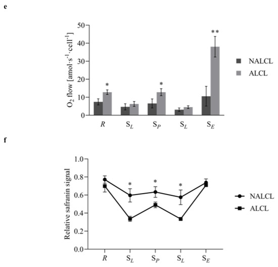Succinate-linked respiration of NALCL and ALCL measured simultaneously with mitochondrial membrane potential in the presence of safranin. (a,b) are the protocols for measuring respiration in NALCL and ALCL, respectively, while (c,d) are the protocols for measuring mitochondrial membrane potential, mtMP using safranin concentration in NALCL and ALCL, respectively. Before the cells were added, safranin was calibrated up to 2 µM. The initial drop to 1.6 µM safranin is mainly due to unspecific binding upon the addition of cells. Low safranin concentrations indicate high mtMP. Titrations: Cell, dig (digitonin, cell permeabilization), Rot (rotenone, CI inhibition), S (succinate, S-LEAK respiration, SL(n)), ADP (S-OXPHOS capacity, SP), Omy (oligomycin, S-LEAK, SL(Omy)), CCCP (S-ET capacity, SE), Mna (malonate, CII inhibition), and Ama (antimycin A, CIII inhibition, Rox). Oxygen consumption was corrected for Rox. Blue plots indicate O2 concentration, red plots are the O2 consumption expressed per cell, and neon plots indicate safranin concentrations. (e) The Rox-corrected respiration and (f) the relative safranin signal: ROUTINE state, R, and in four respiratory states in permeabilized cells: S-linked LEAK respiration in the absence of adenylates, SL(n), S-linked OXPHOS capacity, SP, S-linked LEAK respiration after inhibition of ATP synthase by oligomycin, SL(Omy), and S-linked ET capacity, SE. Results are expressed as mean ± S.D. * denotes p < 0.05 while ** denotes p < 0.01 compared to NALCL as determined by Student’s t-test.
