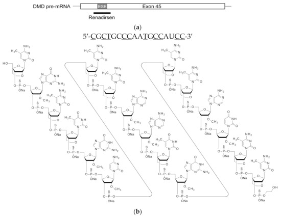 - Heemskerk, H.; De Winter, C.; Van Kuik, P.; Heuvelmans, N.; Sabatelli, P.; Rimessi, P.; Braghetta, P.; Van Ommen, G.J.B.; De Kimpe, S.; Ferlini, A.; et al. Preclinical PK and PD studies on 2′-O-methyl-phosphorothioate RNA antisense oligonucleotides in the mdx mouse model. Mol. Ther. 2010, 18, 1210–1217. [Google Scholar] [CrossRef]