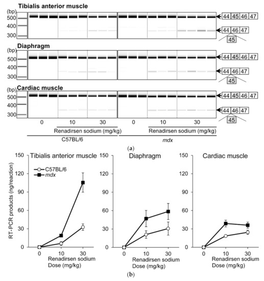 Exon 45 skipping in C57BL/6 and mdx mice after single s.c. administration of renadirsen sodium. (a) Detection of exon-45-skipped RT-PCR products of dystrophin mRNA in C57BL/6 and mdx mouse muscles after single s.c. administration. Total RNA was isolated from tibialis anterior muscle, diaphragm, and cardiac muscle. The structure of each PCR product is schematically shown at the right of the panel. (b) The concentrations of exon-45-skipped RT-PCR products of dystrophin mRNA from tibialis anterior muscle, diaphragm, and cardiac muscle were calculated using an Agilent 2100 Bioanalyzer. Data in (B) are shown as means ± SEM; n = 3–4.