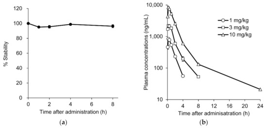 To investigate the pharmacological activity from the perspective of in vivo behavior of the AO, we first analyzed the stability and pharmacokinetics of renadirsen sodium in mice. To determine the stability, renadirsen sodium was incubated with mouse blood, followed by monitoring of the mass peak corresponding specifically to the unchanged form of full-length renadirsen using an LC-MS/MS system. The ratio of the peak area of renadirsen to that of the IS remained stable in mouse blood for at least 8 h (Figure 3a). Consistent with previous studies [18,19,22], these results demonstrated that renadirsen was stable throughout the entire incubation period. Pharmacokinetic analysis of renadirsen sodium was performed in male mdx mice following subcutaneous injection of 1, 3, and 10 mg/kg doses. The blood samples were collected at different time points after injection, and we assessed renadirsen levels using LC-MS/MS analysis (Figure 3b; Supplemental Tables S1 and S2). The plasma concentrations of the free form of renadirsen sodium rapidly decreased below the lower limit of quantification (<20.0 ng/mL) and were not detected in any of the plasma samples collected at 72 h after administration. The time to maximum plasma concentration (Tmax) was determined to be 0.25 h for all doses tested, showing that renadirsen was immediately absorbed after subcutaneous administration. The absolute bioavailability value at 3 mg/kg was calculated to be 73.9%. Systemic exposure increased in a dose-dependent manner.