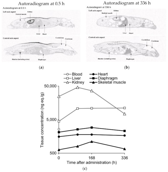 Concentrations of radioactivity in tissues after single subcutaneous administration of [14C] renadirsen sodium at 10 mg/kg in C57BL/6 mice. (a) Autoradiograms at 0.5 h after administration. (b) Autoradiograms at 336 h after administration. (c) Concentrations of radioactivity in tissues were quantified by whole-body autoradiography (QWBA) at 0.5, 96, 168, and 336 h after administration. n = 1 per time point. Radioactivity in the blood (open circle) decreased below the limit of quantification at 96 h after administration. Open squares, open triangles, closed circles, closed squares, and closed triangles represent the liver, kidney, heart, diaphragm, and skeletal muscle, respectively.