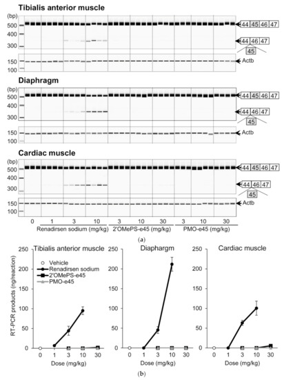 Effects of renadirsen sodium, 2′OMePS-e45, and PMO-e45 on dystrophin exon 45 skipping in mdx muscles. (a) Detection of exon-45-skipped RT-PCR products of dystrophin mRNA in various muscles from mdx mice after systemic delivery of renadirsen sodium, 2′OMePS-e45, or PMO-e45. Each compound was injected subcutaneously into mdx mice once a week for 4 weeks. Total RNA was isolated from the tibialis anterior muscle, diaphragm, and cardiac muscle. The structure of each PCR product is shown schematically at the right of the panel. (b) The concentrations of exon-45-skipped RT-PCR products of dystrophin mRNA from the tibialis anterior muscle, diaphragm, and cardiac muscle were calculated using an Agilent 2100 Bioanalyzer. Data in (B) are shown as means ± SEM; n = 3–4.