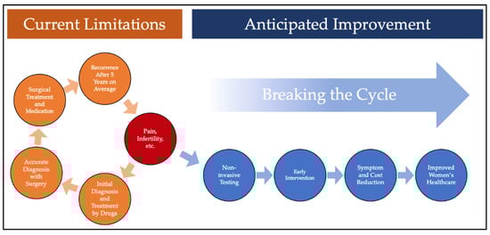 Endometriosis is a chronic inflammatory disease characterized by the presence of endometrial glands and stroma outside of the uterine cavity [1]. The presence of these ectopic cells has often been associated with severe pelvic pain and infertility [2]. It is estimated that 10–15% of reproductive age women are affected by endometriosis, and that 70% of women presenting with chronic pelvic pain are subsequently diagnosed with endometriosis [3,4]. The typical method for endometriosis diagnosis is surgical, requiring visual evidence that can be biopsied for pathologic confirmation [5]. Although the disease is well-known and has established diagnostic criteria, the average time between the onset of symptoms and diagnosis of endometriosis is 6.7 years [6]. The burden of endometriosis can be mentally, emotionally, and physically taxing. Women who struggle with endometriosis face a decreased quality of life due to chronic pain, infertility, numerous hospitalizations, missed workdays, and often undergo a barrage of surgeries and radiographic imaging studies [7]. The annual healthcare cost combined with the cost of associated productivity loss was extrapolated to be $22 billion in the United States in 2002 [8]. A more recent retrospective study showed that patients diagnosed with endometriosis incurred significantly higher direct and indirect healthcare costs compared to matched healthy controls [9].