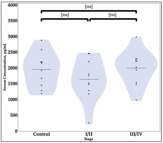 Comparison of Serum Concentrations of BCL6. No statistically significant difference is observed in the serum levels of BCL6 in healthy individuals compared to patients with I/II or III/IV Endometriosis. The “Control” group is patients with no endometriosis. The groups “Stage I/II” and “Stage III/IV” contained samples with stages I or II and stages III or IV endometriosis, respectively (ns = not significant).