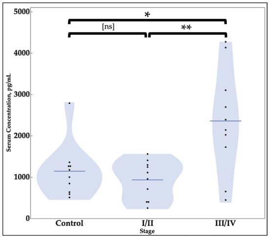 Comparison of Serum Concentrations of SIRT1. A statistically significant difference is observed in the serum levels of SIRT1 in stage III/IV endometriosis patients compared to stage I/II endometriosis patients and healthy individuals. The groups “Stage I/II” and “Stage III/IV” contained samples with stages I or II and stages III or IV endometriosis, respectively. There was a statistically significant difference between the group “Stage I/II” and “Stage III/IV” with a p-value of 0.0038. There was also a statistically significant difference between the “Control” and “Stage III/IV” with a p-value of 0.0152. (ns = not significant, * p ≤ 0.05, ** p ≤ 0.01).