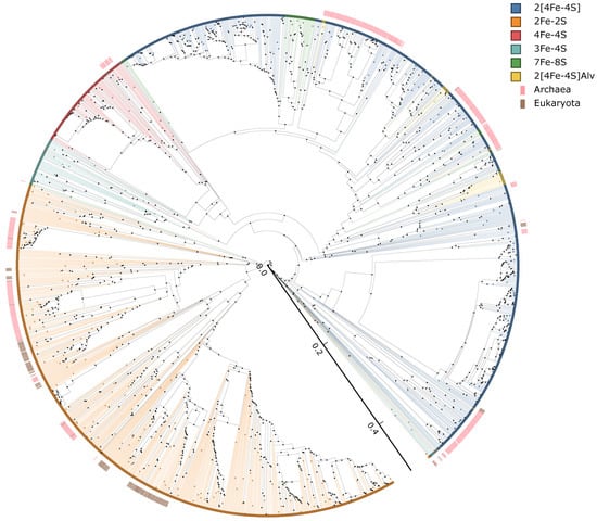Phylogenetic analysis of ferredoxins. Ferredoxins belonging to different Fe-S cluster types were highlighted in different colors and indicated in the figure. Archaea and Eukaryota ferredoxin sequences were marked with pink and brown stripe, respectively. All other sequences originate from Bacteria. Ferredoxin protein sequences used to construct the phylogenetic tree are presented in Tables S2 and S3.