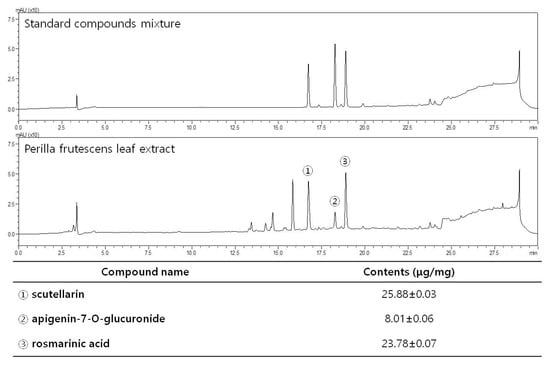HPLC chromatograms of a standard mixture of scutellarin, apigenin-7-O-glucuronide, and rosmarinic acid, and Perilla frutescens leaf extract obtained using a YMC Triart C18 column monitored at 254 nm of peak area, 30 min of run time, 1.0 mL/min of flow rate. Peaks of scutellarin, apigenin-7-O-glucuronide, and rosmarinic acid are indicated with circled numbers “1”, “2”, and “3”, respectively.