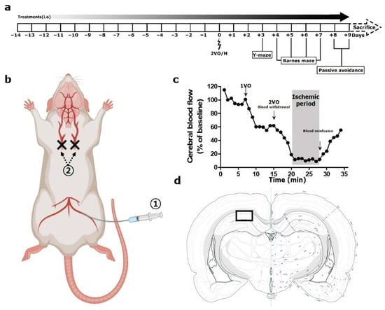 Graphical illustration of the in vivo experiment setup. (a) Schematic overview of the in vivo experiment, (b) surgical procedure, (c) a representative Doppler flowmetry traced for the entire operation time, and (d) the area of interest for histologic analyses in this study are presented. In (b), circled “1” and “2” represent the steps of femoral artery catheterization and ligatures of both common carotid arteries in the 2VO/H operation, respectively. In (d), a rectangular box indicates a 300 µm-width area in hippocampal Cornu ammonis 1, which was used for histologic analyses.