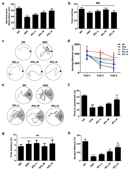 Effects of PFL on memory deficits in VaD rats. (a) Spontaneous alternation and (b) total arm entries of different groups were measured using the Y-maze test. Using the Barnes maze trial test session, (c) tracking plots made at the 3rd trial day and (d) time-dependent changes in the moved distance to the platform of different groups were obtained. Using the Barnes maze probe test session, (e) tracking plots and (f) time spent in the target quadrant of different groups were obtained. In the tracking plots, the locations of the platform and target quadrant are indicated as a black circle and dark area, respectively. (g) Trial latency and (h) escape latency in different groups were measured using the passive avoidance test. In all graphs, values are presented as the mean ± SEM (*** p < 0.001 vs. SO; # p < 0.05, ## p < 0.01, and ### p < 0.001 vs. VEH; §§ p < 0.01 vs. PFL-L; and NS, statistically not significant).