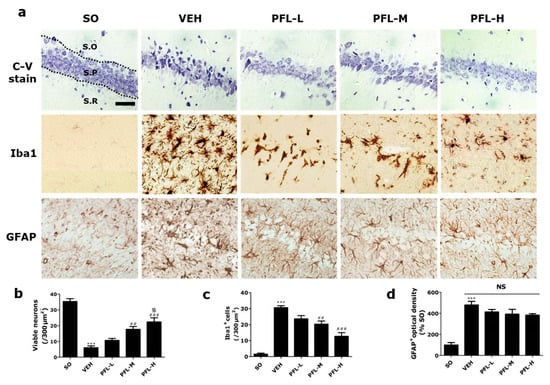 Next, we investigated whether PFL intake could attenuate neuronal damage in the hippocampal structure, which is an essential feature in VaD patients []. For this, we used C-V staining to assess the effects of perioperative PFL treatment on the 2VO/H-induced loss of pyramidal neurons in the hippocampus, especially in the CA1 subregion. On POD 9, the VEH group showed a dramatic decrease in the number of viable hippocampal CA1 neurons compared to that of the SO group (*** p < 0.001; Figure 4a,b). The VEH group also showed the presence of apoptotic neurons, which were characterized by pyknotic nuclei and shrunken cytoplasm, in all three layers, i.e., the stratum oriens (S.O), pyramidale (S.P), and radiatum (S.R), of the CA1 region. However, the number of surviving neurons was significantly higher in both the PFL-M and PFL-H groups (## p < 0.01 and ### p < 0.001 vs. VEH), and this change was dose dependent (§§ p < 0.01 vs. PFL-L). Since neuroinflammation is essentially combined with VaD, we next quantified the extent of microglial and astrocytic activation by immunohistochemical detection of Iba1 and GFAP, which are used as markers for microglia and astrocytes, respectively. The number of Iba1+ microglia in all three layers was approximately 30 times higher in the VEH group (30.0 ± 0.8 vs. 1.1 ± 0.1; *** p < 0.001; Figure 4a,c) than the SO group. However, the number of activated microglia was significantly lower in the PFL-M group (## p < 0.01 vs. VEH), and this reduction was more exaggerated in the PFL-H group (### p < 0.001 vs. VEH). Contrary to expectations, there was no difference between the optical densities of GFAP+ astrocytes in the PFL-treated groups and VEH group (Figure 4a,d; NS, statistically not significant). Collectively, these results suggest that PFL uptake could attenuate both VaD-associated neuronal loss and the associated microglial activation.