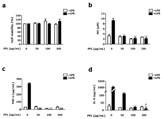 To provide insight into the possible mechanisms underlying the PFL-mediated attenuation of microglial activation, the cytotoxic effect of PFL on BV-2 microglial cells was first evaluated in the presence or absence of LPS (1 μg/mL) using MTT assays. As shown in Figure 5a, PFL showed no cytotoxicity at all concentrations (50, 100, and 200 μg/mL) tested in this study, regardless of the presence of LPS. Accordingly, we used PFL at the indicated concentrations to further evaluate the inhibitory effects on the production of inflammatory mediators, such as NO, TNF-α, and IL-6, as shown in Figure 5b–d, respectively. When BV-2 cells were pretreated with PFL for 12 h, LPS-mediated production of NO, TNF-α, and IL-6 was significantly decreased. Among the dynamics, pretreating BV-2 cells with PFL showed a dose-dependent attenuation in LPS-induced IL-6 production (vs. 111.2 ± 4.7 in 50 μg/mL PFL-treated 5.8 ± 3.2 in 200 μg/mL PFL-treated; # p < 0.05; Figure 5d). Treatment with PFL did not affect the parameters mentioned above under the LPS-free conditions. Together, these results indicate that PFL suppressed NO, TNF-α, and IL-6 production in activated microglia.