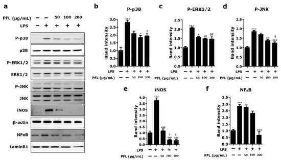 Cells (1 × 107 cells/well in 12-well plates) were pretreated with PFL (0, 50, 100, and 200 μg/mL) for 12 h, followed by stimulation with 1 μg/mL LPS for 24 h. The cell pellets were collected by centrifugation, resuspended in PRO-PREPTM lysis buffer, and centrifuged. Protein concentrations in the supernatant fractions were determined using a BCA assay kit. Then, 30 μg aliquots of protein were subjected to electrophoresis on 10% sodium dodecyl sulfate-polyacrylamide gels and transferred onto polyvinylidene fluoride membranes (Bio-Rad, Hercules, CA, USA). The membranes were incubated in a 5% skim milk solution and then with antibodies against phosphorylated (p-) p38, p38, p-extracellular signal-regulated kinase (p-ERK), ERK, p-c-Jun N-terminal kinase (p-JNK), JNK, and iNOS. For blotting of NFκB, the nuclear fraction was obtained using a Qproteome cell compartment kit, as described by the manufacturer. β-actin and LaminB1 were used as internal controls of cellular homogenates and nuclear fractions, respectively. The membranes were washed with PBS containing 0.1% Tween-20, incubated with the horseradish peroxidase-conjugated secondary antibody for 1 h, and the resulting bands were identified with an enhanced chemiluminescence kit. The band intensity was measured using ImageJ and normalized to that of β-actin or LaminB1. Data were expressed as fold changes from the control values and collected from at least three independent experiments.