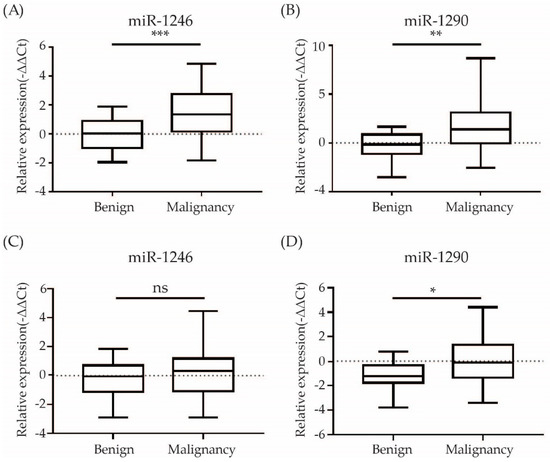 - Li, A.; Yu, J.; Kim, H.; Wolfgang, C.L.; Canto, M.I.; Hruban, R.H.; Goggins, M. MicroRNA Array Analysis Finds Elevated Serum miR-1290 Accurately Distinguishes Patients with Low-Stage Pancreatic Cancer from Healthy and Disease Controls. Clin. Cancer Res. 2013, 19, 3600–3610. [Google Scholar] [CrossRef] [Green Version]