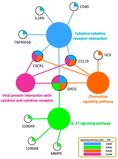 GRO1 (melanoma growth stimulating activity, alpha) also known as CXCL1, is a protein-encoding gene and plays an important role in inflammation and immune defense due to the modulation of leukocyte infiltration [66], which has been previously proposed as a biomarker and therapeutic target in mastitis [67]. This gene is also involved in the metabolic pathways of cytokine–cytokine-receptor interaction, the IL-17 signaling pathway, the chemokine signaling pathway, and viral protein interaction with cytokines and cytokine receptors. In the case of the cytokine–cytokine-receptor interaction pathway, other genes, such as CD40, IL1RN, CXCR1, TNFRSF6B, and CCL19, were found to be involved in mastitis defense or immune response, as all these genes were upregulated in the mastitic cows based on their FC values. The significant role of cytokines in the immune response to infectious agents is well known because they are soluble extracellular proteins or glycoproteins that are crucial intercellular regulators and mobilizers of cells engaged in innate as well as adaptive inflammatory host defenses, cell growth, differentiation, cell death, and cell development and repair processes. It was previously reported that cytokines can participate in activation of the host defense mechanisms during mastitis [68,69]. The CXCR1 and CCL19 genes were also enriched in two other pathways of the chemokine signaling pathway and in viral protein interaction with cytokines and cytokine receptors. CXCR1 (chemokine (C-X-C motif) receptor 1), identified as a hub gene, is a protein-encoding gene for major pro-inflammatory cytokine receptors [70] that is introduced as a potential genetic marker for resistance to mastitis in dairy cows [71,72]. In our study, the gene CXCR1 was involved in seven GO terms—response to stimulus, immune response, cellular response to stimulus, neutrophil chemotaxis, biological regulation, cellular process, and cellular response to cytokine stimulus for biological processes (Table 4). In addition, earlier studies have reported that a non-synonymous mutation, c.365C > T, located in exon II of the CXCR1 gene is associated with susceptibility to mastitis in different breeds of cattle [73,74]. The viral protein interaction with cytokines and the cytokine receptor pathway is an immune system pathway which has a key role in the inflammatory responses to infection and may activate or inhibit cytokine signaling and possibly affect different aspects of immunity. Furthermore, the S100A8, S100A9, and MMP9 genes have been recognized as components of the IL-17 signaling pathway. This pathway plays crucial roles in both acute and chronic inflammatory responses. In fact, the interleukin 17 (IL-17) family, as a subset of cytokines, signals via their correspondent receptors and activates downstream pathways that include NF-kappaB, MAPKs, and C/EBPs to induce the expression of antimicrobial peptides, cytokines, and chemokines. S100A9 and MMP9, which were identified as hub genes and which were upregulated in the mastitic cows, play key roles in the regulation of immune response and inflammatory pathways [65,66].