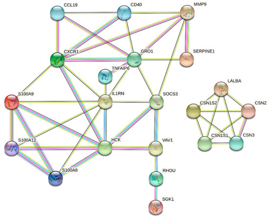 Protein–protein interaction (PPI) networks for up- and downregulated genes were reconstructed with the STRING database, which indicated the physical connection between two or more protein molecules related to biochemical functions (Figure 4). Twenty-one nodes with 45 connections (edges) were represented in the PPI network, as presented in Figure 4. Moreover, we considered hub genes based on their higher-degree connectivity values in the PPI network. A total of seven hub genes, including MMP9, HCK, GRO1, SOCS3, CXCR1, IL1RN, and S100A9, were identified, all of which were overexpressed genes. All the hub proteins identified are protein-coding genes. The functional enrichment analysis demonstrated that hub genes were involved in the majority of molecular functions and biological processes (Table 4).