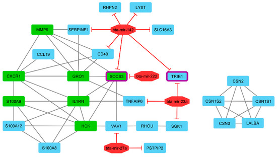 We also aimed to determine whether the expression of miRNAs was associated with that of the 33 DE genes in the mastitic and healthy cows. Among the DE miRNAs, bta-mir-222, bta-mir-27a, bta-mir-23a, and bta-mir-142 suppressed 11 of the identified DE genes as targets of the selected miRNAs. A target gene search using TargetScan demonstrated that bta-mir-142 has seven target genes, namely, RHPN2, LYST, SERPINE1, CD40, SOCS3, TRIB1, and SLC16A3, followed by bta-mir-23a having three target genes, SGK1, TNFAIP6, and TRIB1. In addition, bta-mir-27a suppressed the PSTPIP2 and VAV1 genes, and bta-mir-222 suppressed the SOCS3 gene. The TRIB1 and SOCS3 genes displayed the highest suppression by miRNAs. The identified target genes, associated with their miRNAs, are visualized in Figure 5. For constructing the gene regulatory network, we compiled a list of DE genes and miRNAs (as nodes) involved in mastitis based on literature mining and PPI resources. Briefly, miRNA–gene bipartite networks are commonly represented in an undirected graph format, with nodes representing miRNAs or genes and edges corresponding to interactions (genes–genes and miRNAs–targeted genes). In this network, we identified 30 nodes (26 genes and four miRNAs), with 57 edges interacting with it (Figure 5).