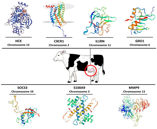 Modeling of the 3D protein structure of hub proteins can be an invaluable aid in order to better understand the details of a particular protein because studies of protein structure and function are becoming a promising approach in the field of bioinformatics. Functional characterization of a protein is often facilitated by its 3D structure. Hence, it is necessary that a 3D structure is determined in examining the proteins’ function at the molecular level. Sequence identity, as a measure of the expected accuracy of a model represented, >30% indicates a relatively good predictor of the model [80]. When sequence identity drops below 30%, the main problem becomes the identification of related templates and their alignment with the sequence to be modeled. Based on our results, among the seven hub proteins, HCK, CXCR1, S100A9, and MMP9 showed the highest structural complexity, with sequence identities of 94.6%, 75.4%, 69.9%, and 47.5%, respectively, whereas the proteins of SOCS3, IL1RN, and GRO1 had the lowest structural complexity with sequence identities of 92.6%, 80.1%, and 72.5%, respectively (Figure 6). Consequently, these findings demonstrate the relevance of integrating results from transcriptomic and functional analyses for a better understanding of the function of important genes and molecular mechanisms responsible for mastitis development.