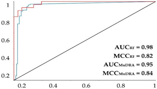 ROC plot for the MuDRA and RF models. AUC—value of the area under the curve; MCC—Matthews correlation coefficient. Red line—RF 5-fold external test cross-validation; blue line—MuDRA fivefold external test cross-validation.