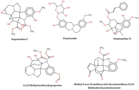 This consensus analysis was performed for each protein studied. Then, the five alkaloids with the highest probability of interacting with the four proteins were selected, therefore making them multitarget and with a greater potential of schistosomicidal activity. Table 4 summarizes the results for these five alkaloids obtained using the combined approach, and Figure 2 shows the chemical structures of these alkaloids. These alkaloids interacted in the active site of all proteins analyzed, with them being potential multitarget alkaloids, and mostly had carbon–hydrogen interactions and H-bonds with the amino acid residues at the active site of the proteins (Appendix A—Figure A3, Figure A4, Figure A5 and Figure A6).