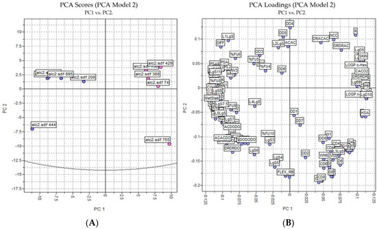 PCA analysis applied to the more active and less inactive alkaloids: (A) score plot (blue—active alkaloids, red—inactive alkaloids) and (B) loading plot.