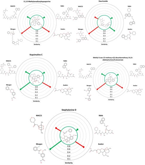 MuDRA plots for five consensus hits. Green—similarity to active compounds against S. mansoni and red—similarity to inactive compounds against S. mansoni.