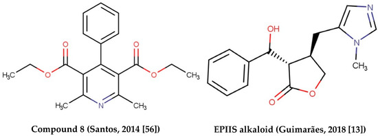 Alkaloids with schistosomicidal activity similar to those in our study were reported in the literature. Santos et al. [56] reported the identification of alkaloid diethyl 4-phenyl-2,6-dimethyl-3,5-pyridinedicarboxylate (Figure 4), isolated from Jatropha elliptica, with 100% lethal activity (50 μg/mL) against adult S. mansoni. Guimarães et al. [13] reported the action of Epiisopilosine alkaloid (Figure 5), which at a 100 mg/kg dose administered orally against S. mansoni in mice, was effective up to 60.61%. In addition, the authors reported no in vitro cytotoxicity (in HaCaT and NIH-3T3 cells) up to 512 μg/mL, and showed that EPIIS had low predicted toxicity in silico using pkCSM software. Rocha et al. [57] performed an in silico method using ADMET predictions and molecular docking applied to five imidazole alkaloids derivates: EPI (epiisopiloturine), EPIIS (epiisopilosine), ISOP (isopilosine), PILO (pilosine), and MAC (Macaubine). The compounds showed high stability, and with the EPIIS present, the best values from the molecular docking experiments corroborated with the results of experimental studies on schistosomiasis.