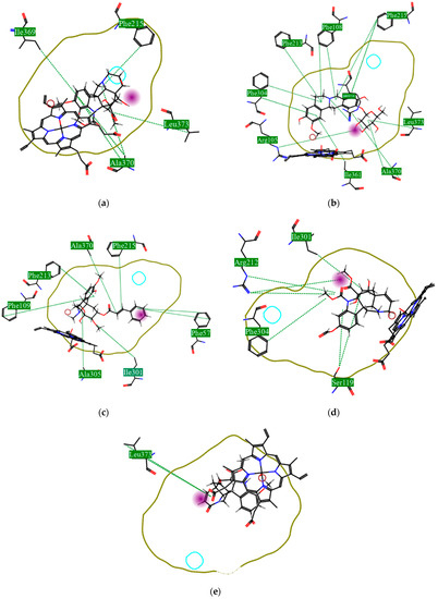 Structural contribution of the molecular coupling between the leading compounds and the liver isoform 3A4 in (a) kopsimaline C, (b) dauricoside, (c) stephalonine D, (d) 11,12-methylemedioxykopsaporine and (e) methyl-3-oxo-12-methoxy-n(1)-decarbomethoxy-14,15-didehydrochanofruticosinate.