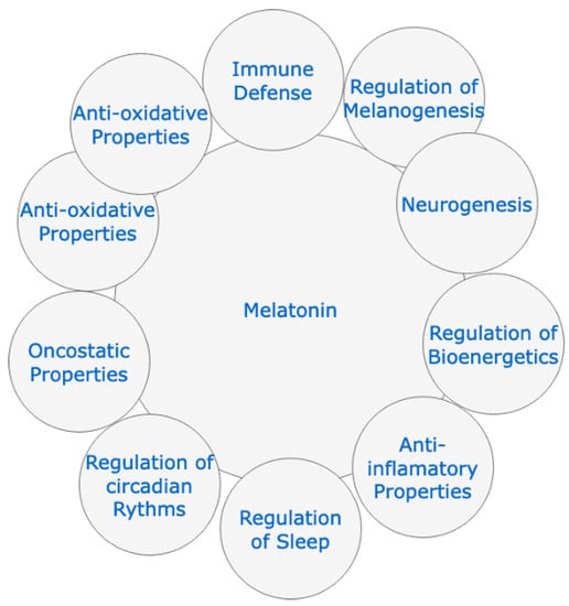 All the above leads to the assertion that melatonin is an active ingredient that alleviates the clinical symptoms of COVID-19, although it does not stop viral replication or transcription []. One of the factors that make older people more susceptible to suffering from the symptoms of this disease is the reduction in the endogenous production of this molecule, together with the increase in CD147 receptors. These authors propose the administration of melatonin in combination with antivirals since they produce a suppression of CD147, reduce the negative effects of antivirals and modulate the immune response.