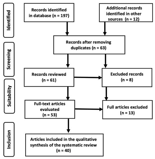 A flow chart with the criteria applied for the article selection process is shown in Figure 3. A total of 197 articles were identified in the initial search, in addition to another 12 articles from other sources. After eliminating duplicates and those that did not meet the inclusion criteria, we were left, in the selection process, with 63 articles. Of these, only 61 were reviewed, subsequently excluding another 8 articles, thus reducing the sample of papers to 53 full-text articles. Finally, due to the existence of other factors, another 13 papers that did not refer exactly to the subject matter of the review had to be excluded. Forty articles remained for the final analysis for the qualitative synthesis of the systematic review.