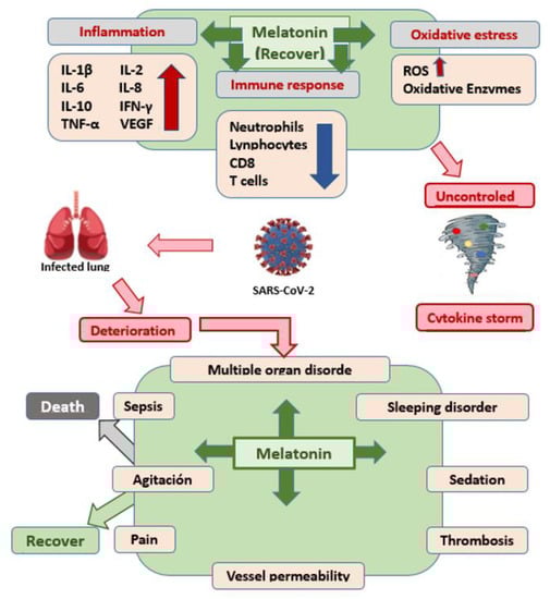 In another interesting contribution [], the beneficial effects of melatonin as an adjuvant in the treatment of SARS-CoV-2 infection are emphasized, which are related to its anti-inflammatory, antioxidant, and regulatory capacity of the immune response, as it is documented in respiratory disorders, shown in Figure 4.