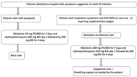 Reiter RJ et al. [] once again describe that high mortality is caused by the uncontrolled innate immune response and the intense inflammatory response, and melatonin can be administered as a prophylactic by regulating the innate immune response’s exaggerated and excessive inflammation, promoting adaptive immune activity. These investigators propose the following therapeutic algorithm shown in Figure 5 for its use in patients affected by the pandemic, suggesting administering a dose of 100–400 mg/day as a supplement, especially if effective antiviral treatment is not available: