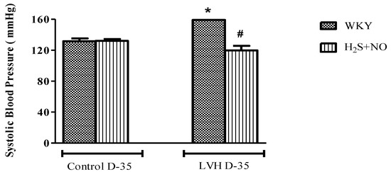 Systolic blood pressure (SBP) and mean arterial pressure (MAP) of all the four experimental groups, i.e., Control-WKY, Control-H2S+NO, LVH-WKY and LVH-H2S+NO groups, showed significant changes in baseline SBP and MAP on day 35. However, there was a significant increase (p < 0.05) in SBP and MAP in LVH-WKY when compared to Control WKY, while the remaining LVH-H2S+NO showed a significantly lower (p < 0.05) SBP and MAP when compared to that of LVH-WKY on day 35, as shown in Figure 1A,B.