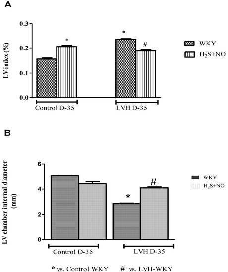 LV index and LV internal diameter of all the four experimental groups—Control-WKY, Control-H2S+NO, LVH-WKY and LVH-H2S+NO groups—showed significant changes in baseline on day 35, as shown in Figure 2A,B. However, there was a significant increase (p < 0.05) in LV index and a significant decrease (p < 0.05) in LV internal diameter in LVH-WKY when compared to that in Control WKY, while the remaining LVH-H2S+NO showed a significantly lower (p < 0.05) LV index and a significantly greater (p < 0.05) LV internal diameter when compared to that of LVH-WKY on day 35, as shown in Figure 2A,B.