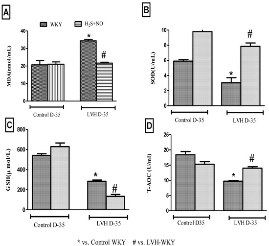 SOD and MDA of all the four experimental groups—Control-WKY, Control-H2S+NO, LVH-WKY and LVH-H2S+NO groups—showed significant changes in baseline on day 35 as shown in Figure 3A,B. However, there was a significant increase (p < 0.05) in MDA and a significant decrease (p<0.05) SOD in LVH-WKY when compared to that in Control WKY, while the remaining LVH-H2S+NO showed a significantly lower (p < 0.05) MDA and a significantly greater (p < 0.05) SOD when compared to that of LVH-WKY on day 35, as shown in Figure 3A,B. GSH and T-AOC were significantly reduced (all p < 0.05) in LVH-WKY, while LVH-H2S+NO did not show any significant change in GSH; however, T-AOC was increased significantly when compared to the LVH-WKY group, as shown in Figure 3C,D.