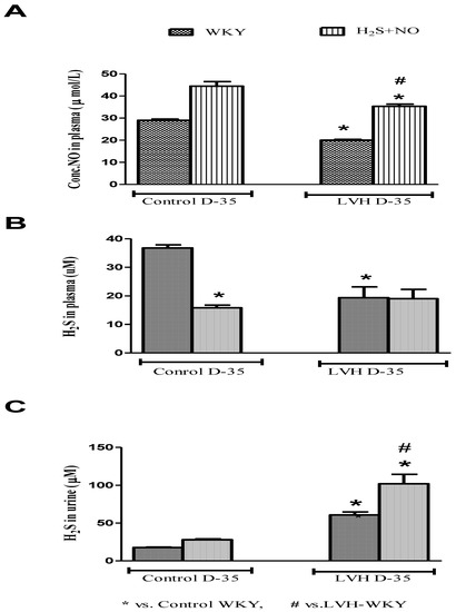 NO and H2S in the plasma of all the four experimental groups—Control-WKY, Control-H2S+NO, LVH-WKY and LVH-H2S+NO groups—showed significant changes in baseline on day 35, as shown in Figure 4A,B. However, there was significant decrease (all p < 0.05) in NO and H2S in the plasma of LVH-WKY when compared to that in Control WKY, while the remaining LVH-H2S+NO showed a significantly higher (p < 0.05) NO in the plasma and insignificant changes observed in the concentration of H2S in the plasma when compared to that of LVH-WKY on day 35, as shown in Figure 4A,B. It was surprising to know that induction of disease and treatment with H2S and NO in LVH has significantly increased (all p < 0.05) the excretion of H2S in the urine when compared to that in Control WKY, as shown in Figure 4C.