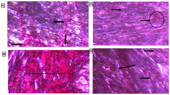 Collagen content was observed by observing the thin strands or bands of collagen stained as red color on the cardiac tissue. There were marked thick bands of collagen on cardiac tissue in the LVH-WKY group, as shown in Figure 7B. Treatment with H2S+NO in Control and LVH groups led to observation of few thin bands of collagen other than diffused and scattered collagen as compared to the LVH-WKY group with the naked eye, as shown in Figure 7C,D, respectively.