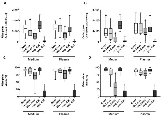 3.1. Rifampicin and Cefuroxime Significantly Reduce Vitality and Cell Proliferation in a Dose-Dependent Manner