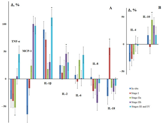 Concentration of salivary cytokines for different stages of breast cancer relative to the control group. (A)—pro-inflammatory cytokines, (B)—anti-inflammatory cytokines. Here and in further figures, the axis “0-0” represents the level of cytokines in the control group. All changes are shown relative to the control group (%). *—differences with the control group are statistically significant, p < 0.05.