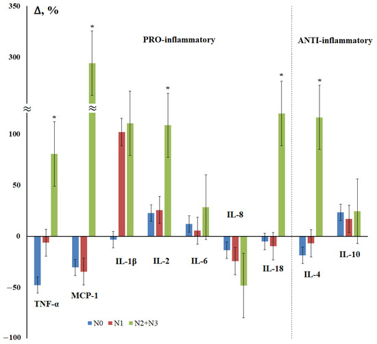 Next, we examined the effect of the degree of damage to regional lymph nodes on the content of cytokines in saliva in breast cancer (Figure 2). It was shown that the maximum deviations from the control group in all cases were observed for patients with N2 + N3; all statistically significant differences were found for this subgroup (Figure 2). For TNF-α, MCP-1, IL-18, and IL-4, the nature of the content change was the same: a decrease for the N0 and N1 subgroups and a sharp increase in the content for the N2 + N3 subgroup (Figure 2).