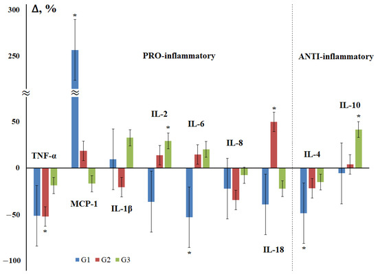 It was shown that in the group of breast cancer patients, only the content of IL-2 and IL-10 changed statistically significantly (Table 1), and in both cases, there was an increase in concentration. For other cytokines and chemokines, an ambiguous pattern of changes in concentrations was observed. Thus, among the pro-inflammatory cytokines in breast cancer, the content of IL-1β, IL-2, and IL-6 increased (+16.1%, +25.0%, and +12.7%, respectively), while for TNF-α, MCP-1, IL-8, and IL-18, the content decreased (−36.2%, −23.8%, −15.0%, and −12.1%, respectively). Among anti-inflammatory cytokines, the same trend was noted: the content of IL-4 decreased (−15.1%), and IL-10 increased in breast cancer (+24.5%, Table 1).