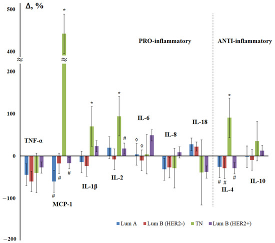 Change in the concentration of salivary cytokines depending on the molecular biological subtype of breast cancer compared with the control group. Lum A—luminal A-like, Lum B (HER2-)—luminal B-like (HER2-negative), TN—triple-negative, Lum B (HER2+)—luminal B-like (HER2-positive) breast cancer. *—differences with the control group are statistically significant; #—differences with TN are significant; ◊—differences with Lum B (HER2+) are significant, p < 0.05.