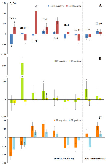 Changes in the concentration of salivary cytokines depending on the status of HER2 (A), estrogen (B), and progesterone (C) receptors in breast cancer compared with the control group. *—differences with the control group are statistically significant, ◊—differences between (−) and (+) are significant, p < 0.05.