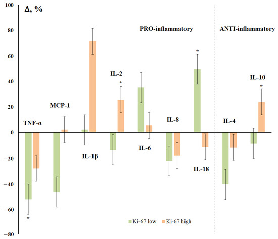 Ki-67 is known to be a protein only expressed in proliferating cells [73]. Importantly, in breast tumors, high levels of Ki-67 have been associated with cancer progression [74], a higher risk of central nervous system metastases, and decreased overall survival and disease-free survival [75]. A high level of Ki-67 is accompanied by an increase in the concentration of IL-1β, IL-2, and IL-10, while in the group with low Ki-67, on the contrary, the level of TNF-α, MCP-1, and IL-4 decreases with an increase in IL-6 and IL-18.