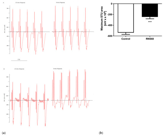 ECG. (a) A. At 3.5 min of hypoxic stress. B. At 9 min of hypoxic stress. (b) STU area in the 9th min of hypoxic stress in ApoE−/−LDLr−/− mice that received the intravenous injection of RNS60 or saline as the control. Values represent mean ± SEM (n = 5); *** p < 0.0001.