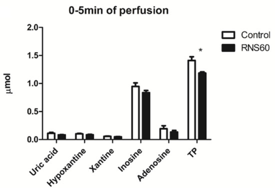 The release of total purine catabolites from the rat hearts during the first 5 min of reperfusion was significantly (26%) lower in the RNS60 group (Figure 4).