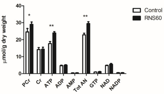 The myocardial concentration of nucleotide and creatine metabolites in the rat heart at the end of protocol involving 4 h of hypothermic (4 °C) ischemia and 15 min of reperfusion in the control and group that received cardioplegia with RNS60. Values represent mean ± SEM (n = 5); * p < 0.01, ** p < 0.003.